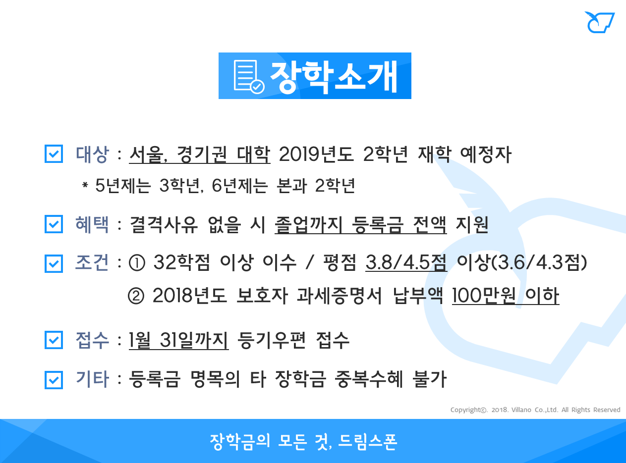 - 졸업 시까지 등록금 전액 지원(결격 사유 없을 시)