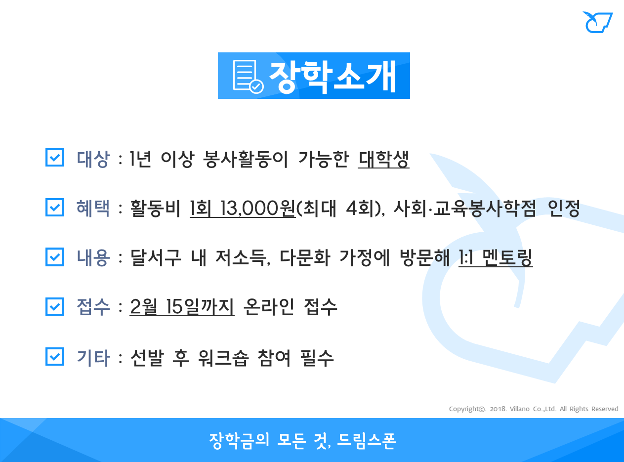 - 장학혜택 : 활동비 1회 13,000원(최대 4회), 사회∙교육봉사학점 인정, 1365 봉사활동 시간 인증, 활동증명">