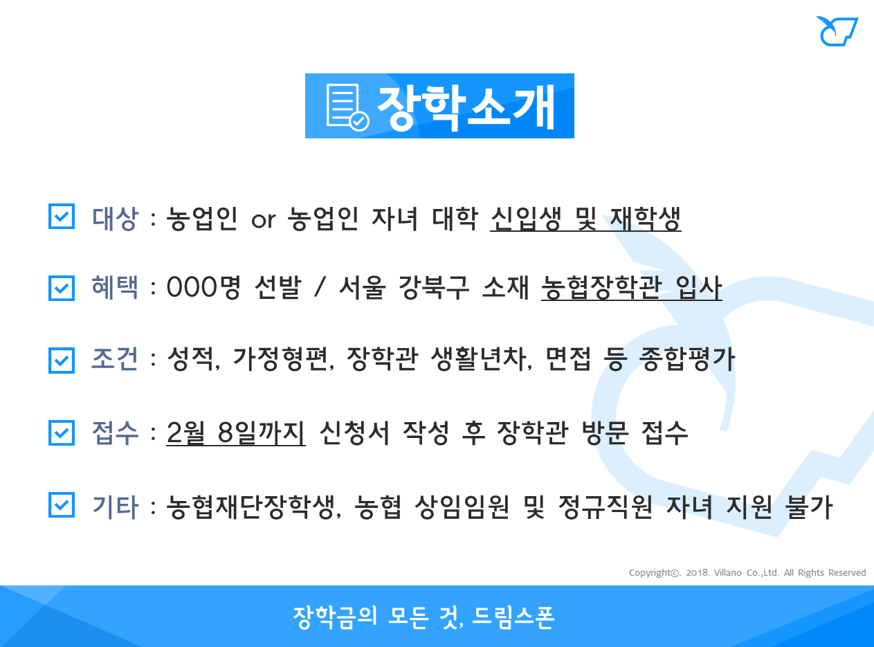 - 장학혜택 : 서울시 강북구 소재 농협장학관 입사