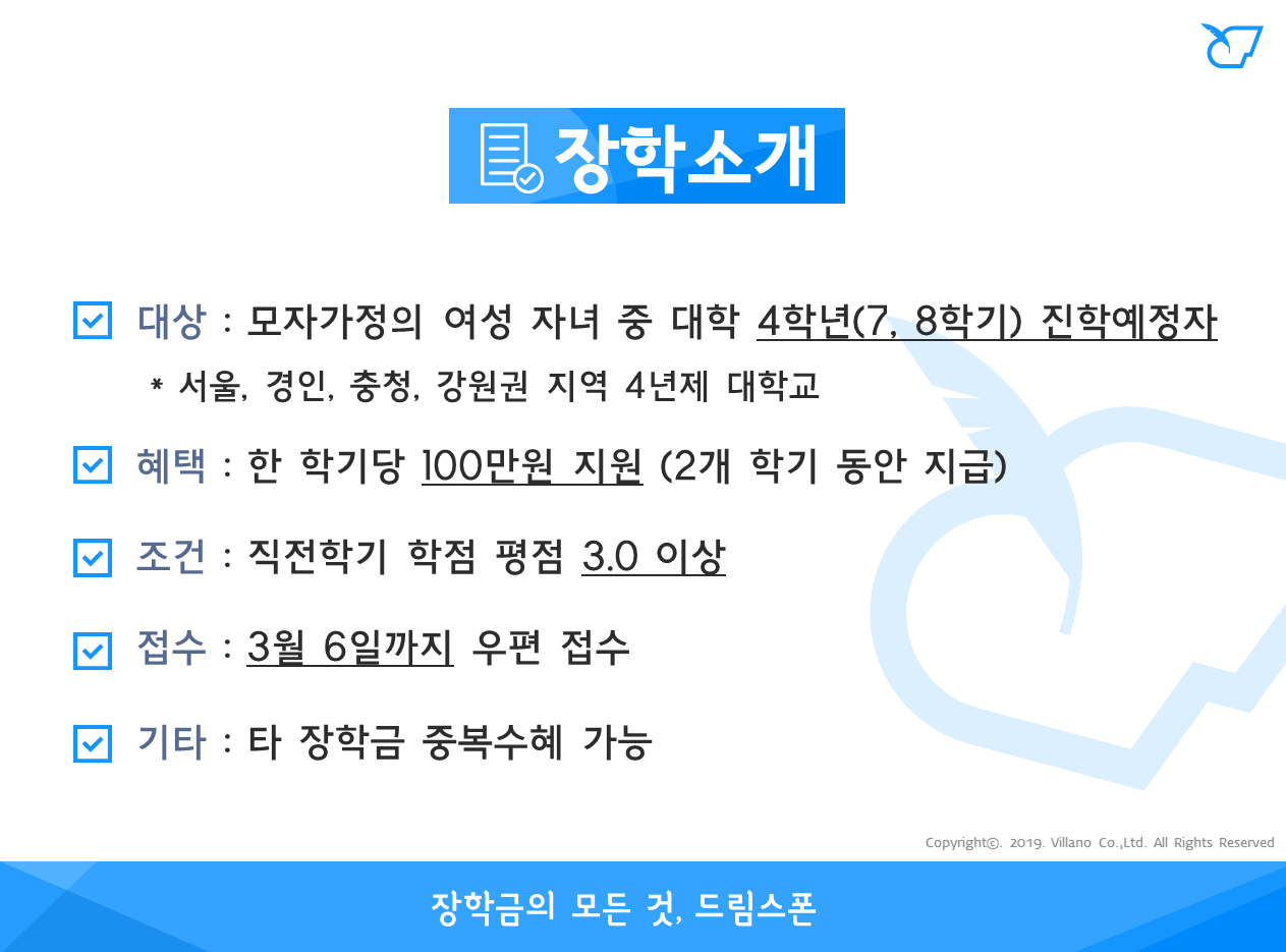 - 장학금액 : 한 학기당 100만원 지원 (2개 학기 동안 지급)