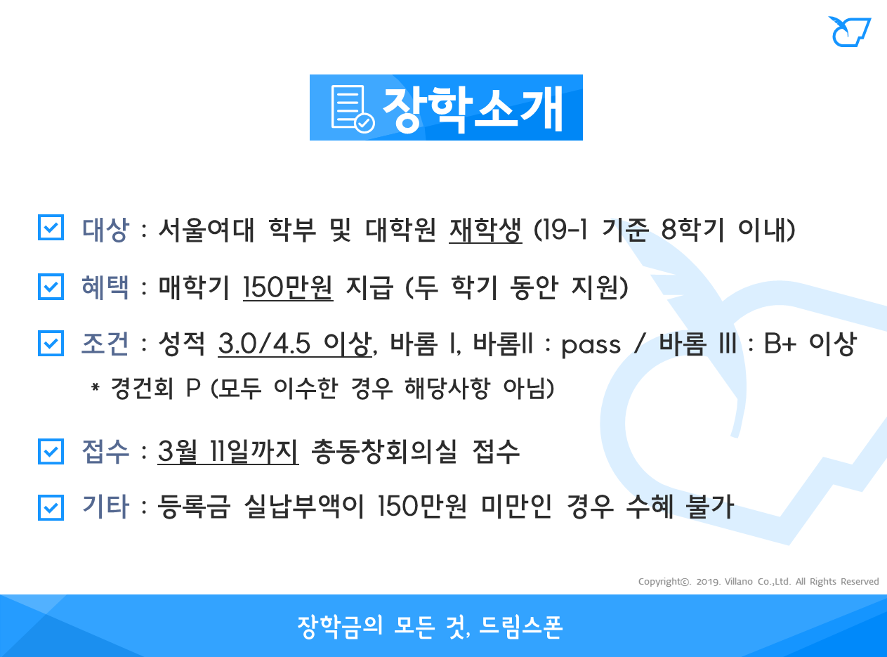 - 장학금액 : 두 학기동안 매학기 150만원 지급