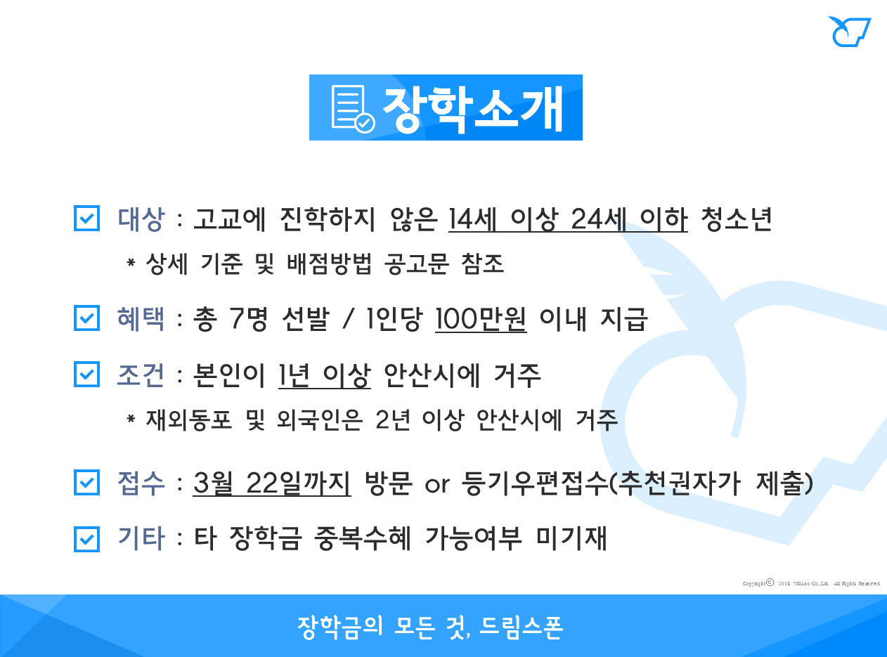 - 총 7명 선발 / 1인당 100만원 이내, 학생이 희망하는 교육기관에 지급