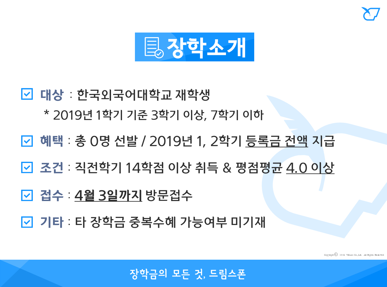 - 총 0명 선발 / 2019년 1학기, 2학기 등록금 전액 지급