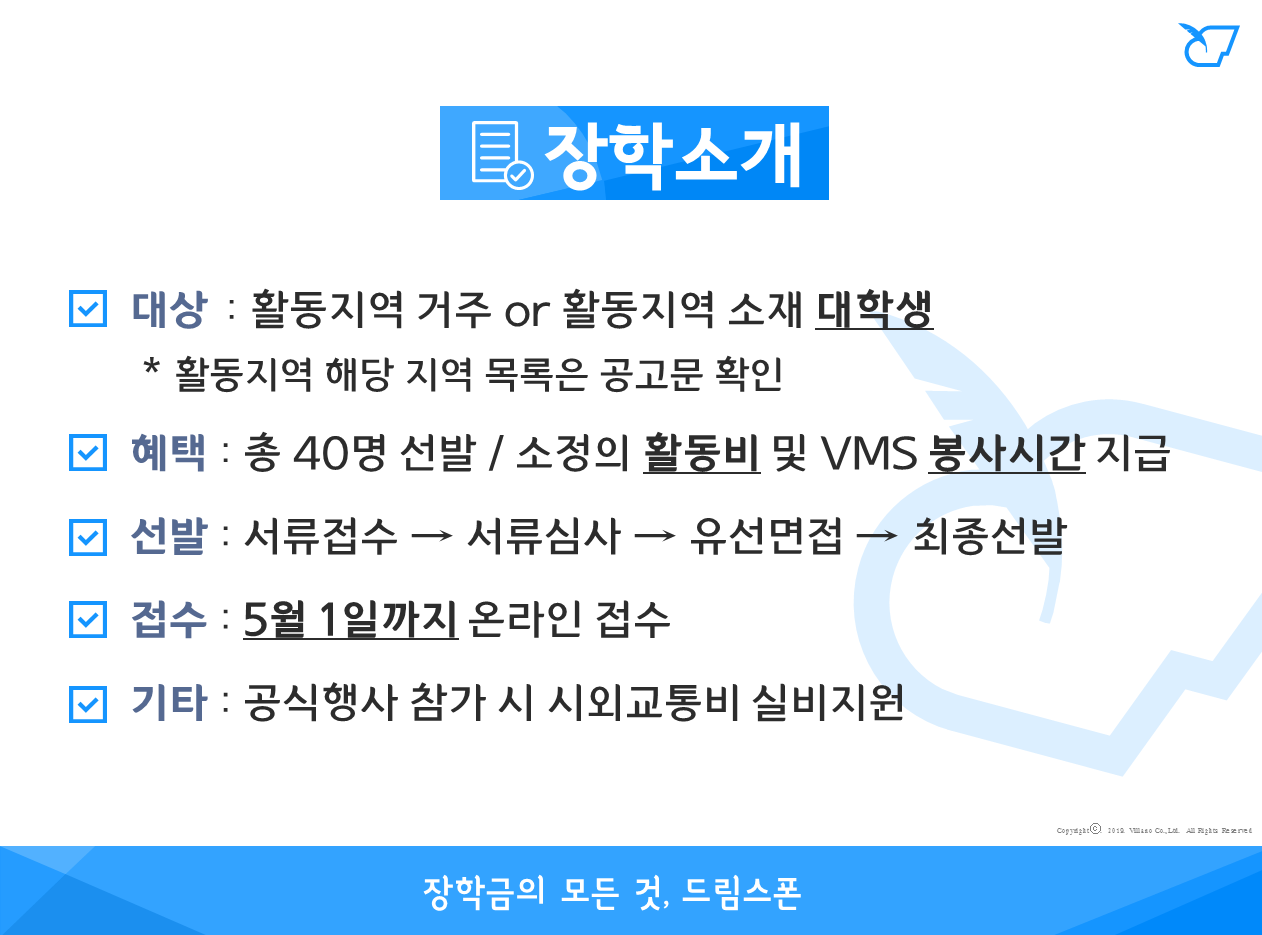 - 장학혜택 : 소정의 멘토링 활동비 & 봉사활동인증서 및 VMS 봉사시간 지급">