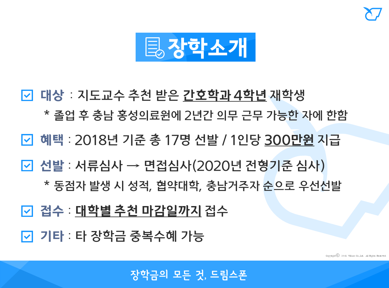 - 졸업 후 충남 홍성의료원 간호사로 2년 근무 조건부 장학금 300만원 지급<">