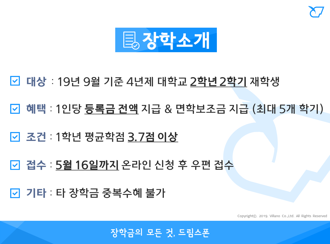 - 장학금액 : 등록금 전액 지급 & 면학보조금 매월 40만원 지급 (4학기부터 졸업시까지)