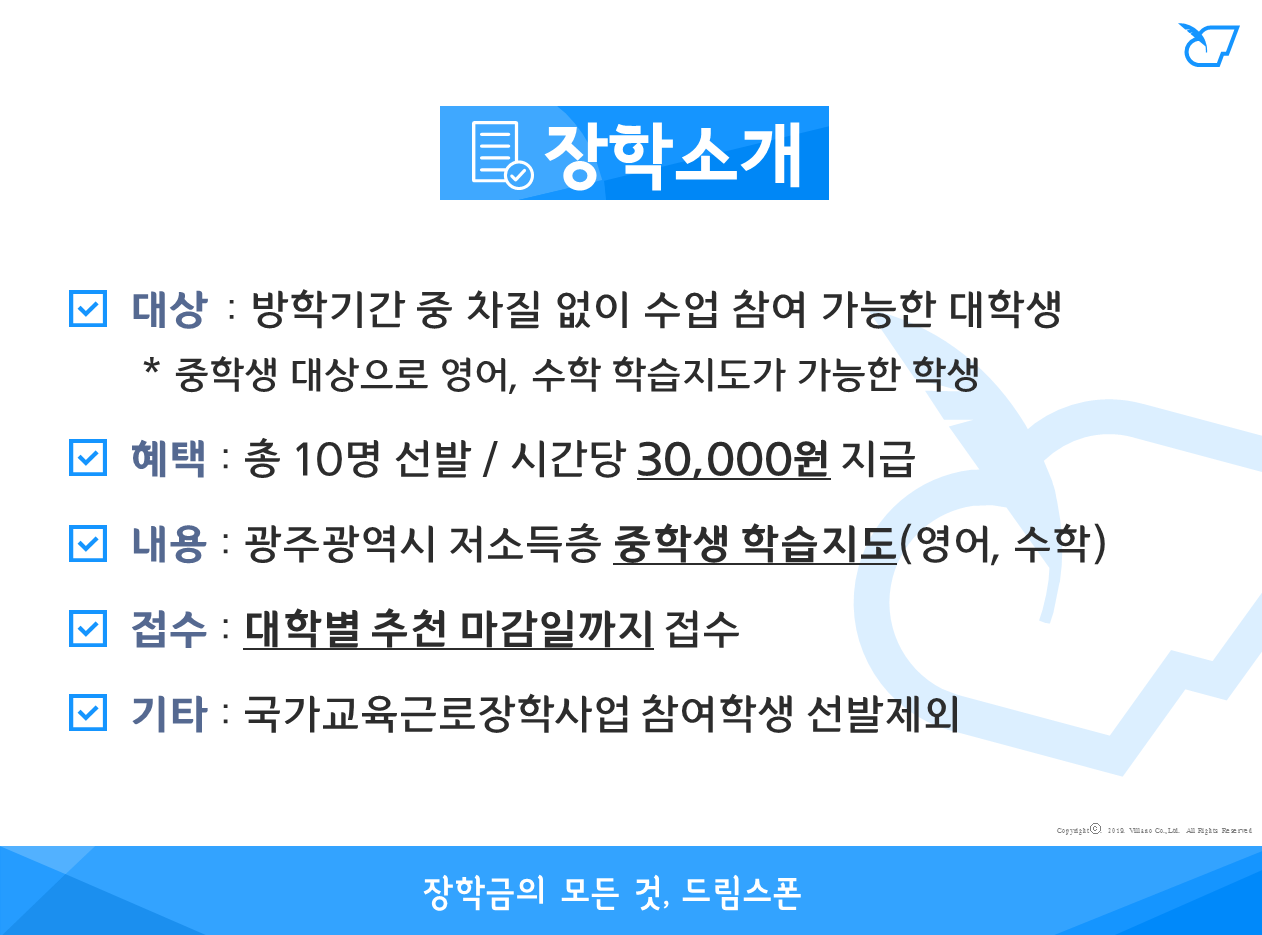 - 내용 : 저소득층 가정 중학생 자녀 학습 지도(영어, 수학)