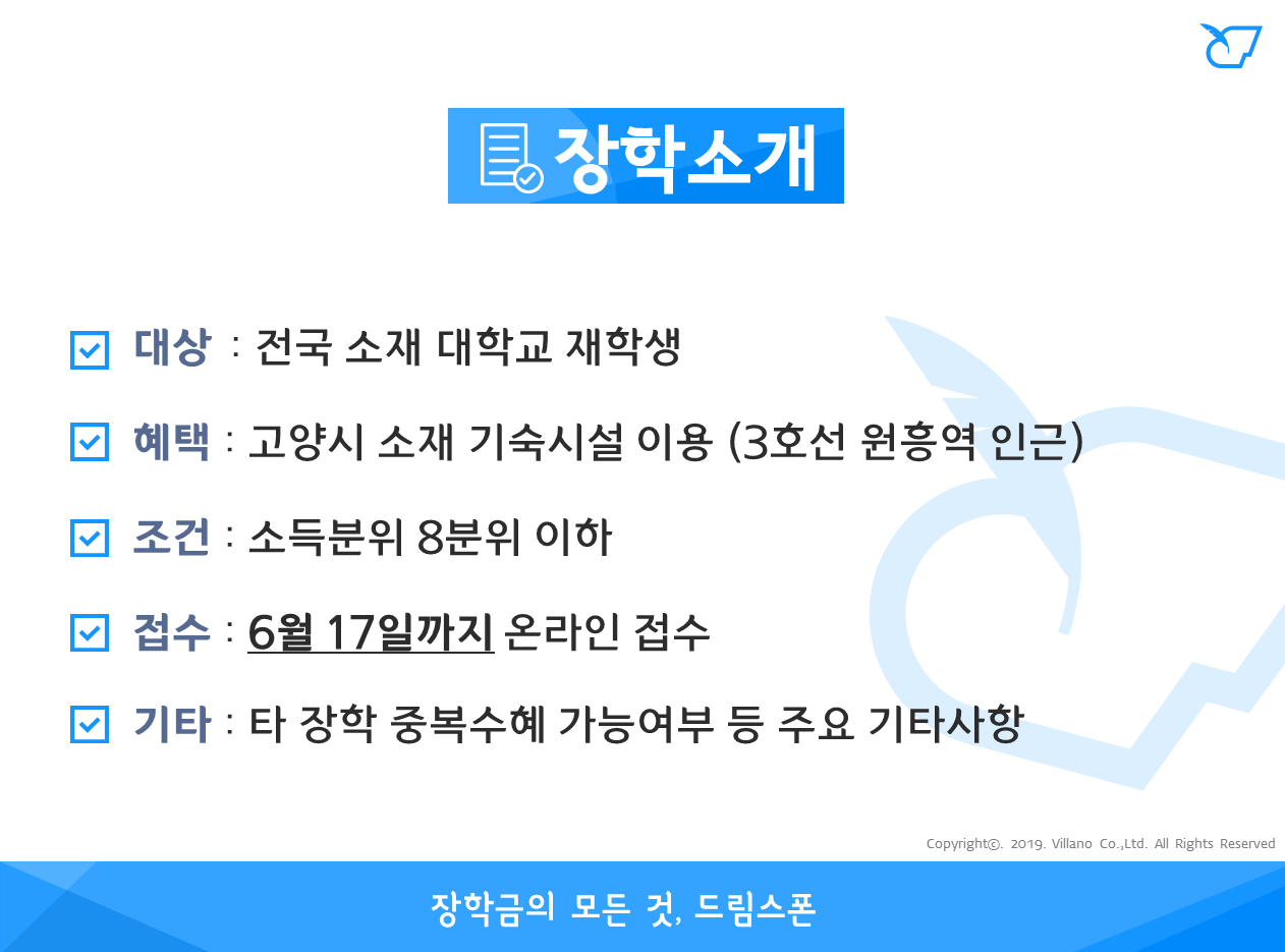 - 장학혜택 : 고양시 소재 기숙시설 이용(3호선 원흥역 인근)