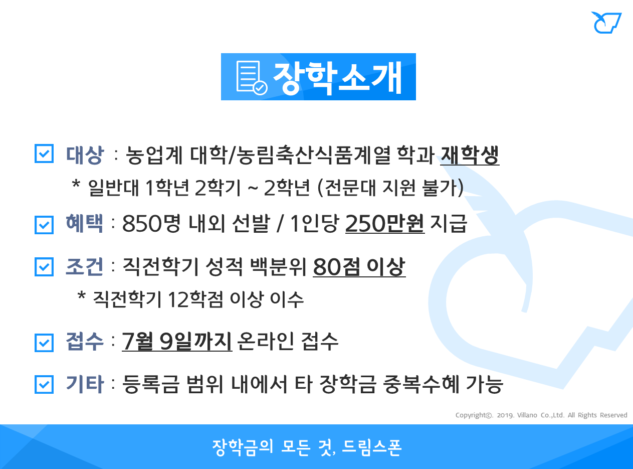 - 장학금액 : 1인당 250만원 지급 (한 학기 기준)