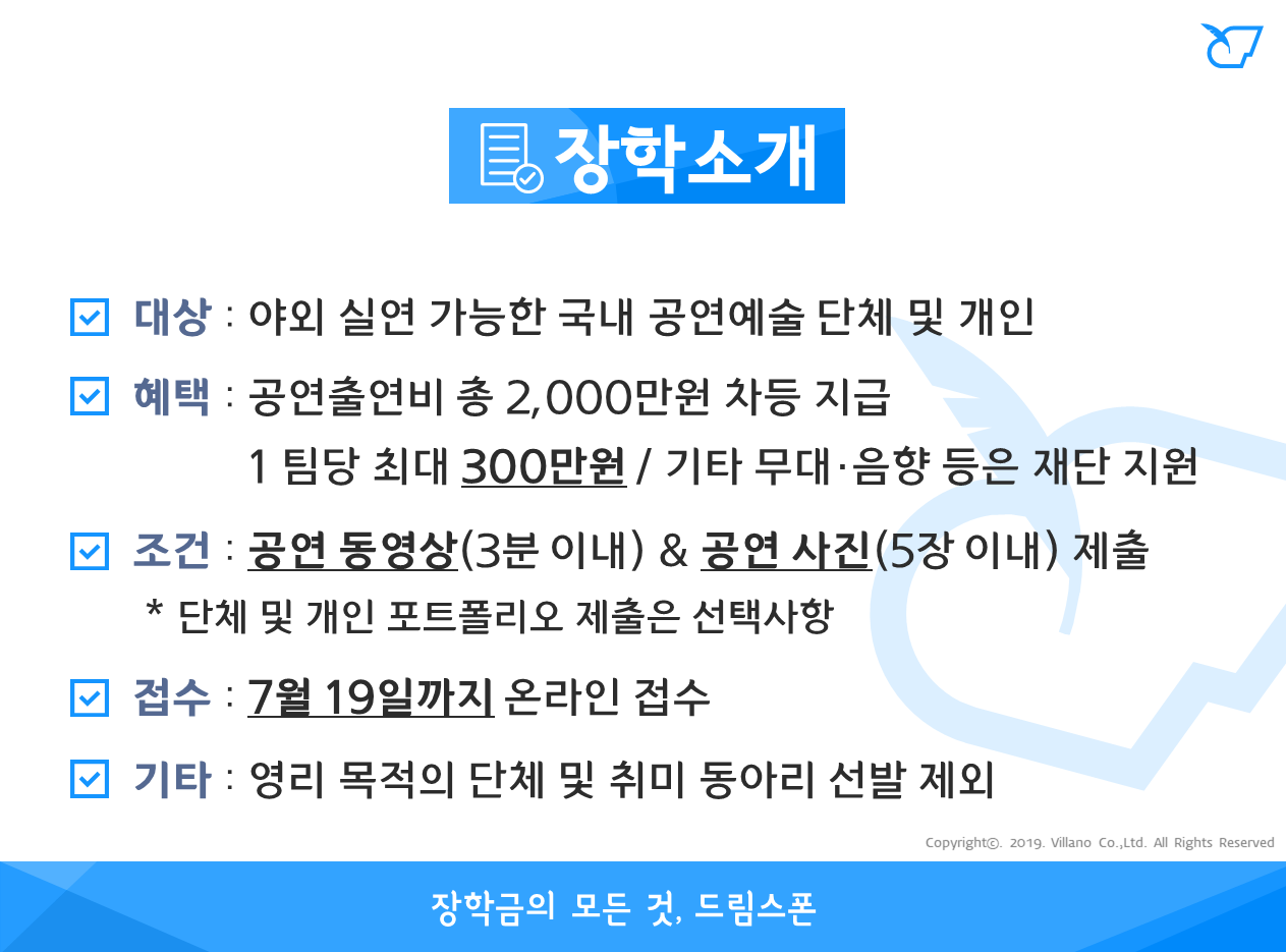 - 공연출연비 총 2,000만원 차등 지급 / 1팀 당 최대 300만원 지급