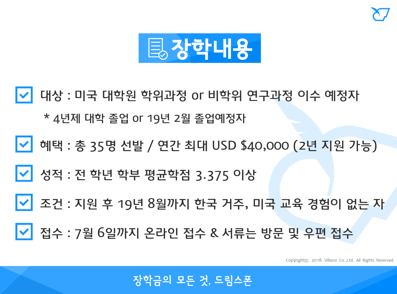 - 2019년도 선발예정인원은 인문/사회/예술 분야 30명, 자연과학/생명과학/공학분야 5명이다.