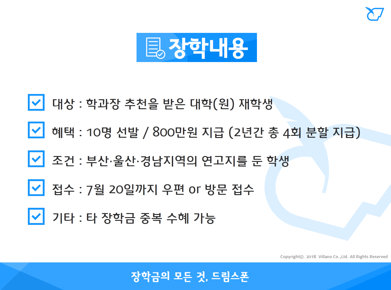 차단하기 클릭 시, 일반 장학금 검색 및 맞춤 장학금에는 보여지지 않습니다. 장학금 차단을 해제하기를 희망하는 경우 마이페이지 – 차단 장학금에서 해제하시면 됩니다.