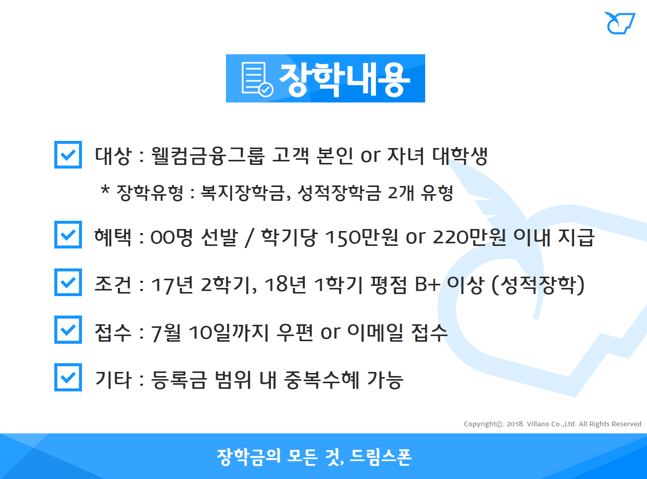 - 복지장학금 : 중,고,대 00명 / 학기당 150만원 이내