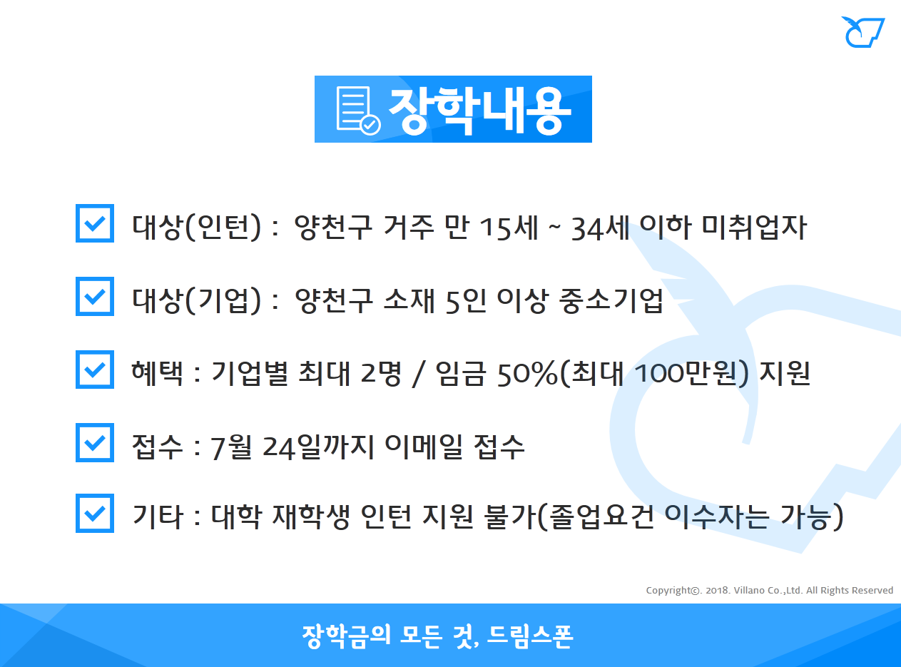 - 기업 : 양천구 소재 「중소기업기본법」상 중소기업으로 인턴기간 종료 후 정규직 전환 계획이 있는 상시근로자 5인 이상인 기업