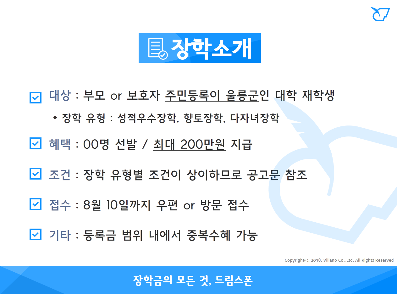 - 대학 재학생 : 100만원(향토, 다자녀) or 150만원(성적/전문대) or 200만원(성적/일반대) 지급