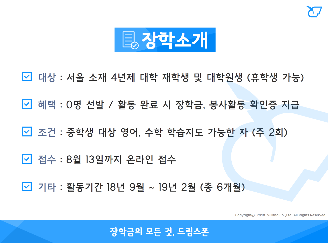 - 활동 내용 : 매주 2회, 1회기 당 2시간 이상 기관에 방문하여 학습 지도, 문화활동프로그램 참여