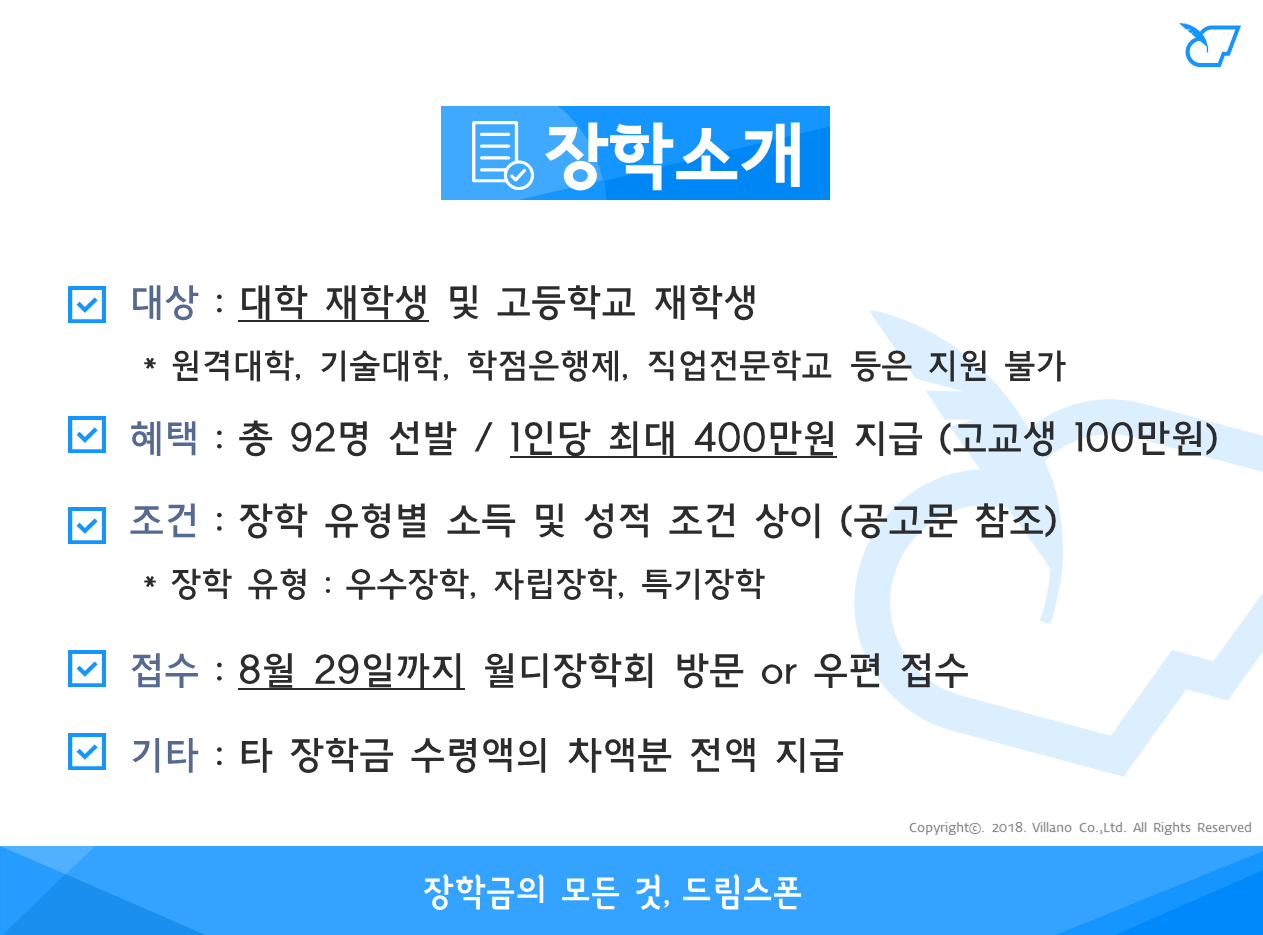 - 우수장학 : 고교생 20명 선발 및 1인당 100만원 지급 / 대학생 30명 선발 및 1인당 400만원 지급