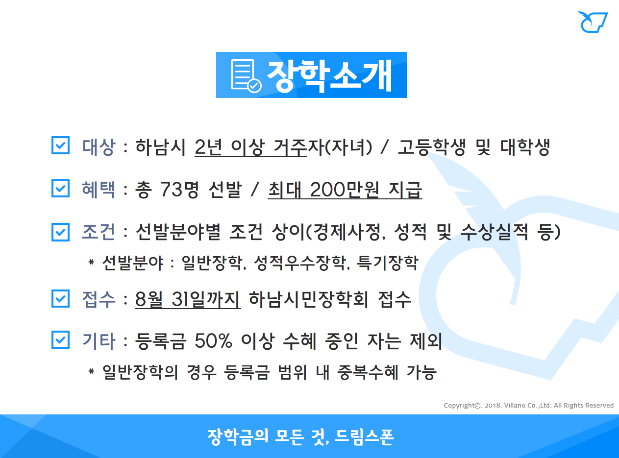 - 지급금액 : 69,000천원 (고등학생:50만원, 전문대:150만원, 대학생:200만원)