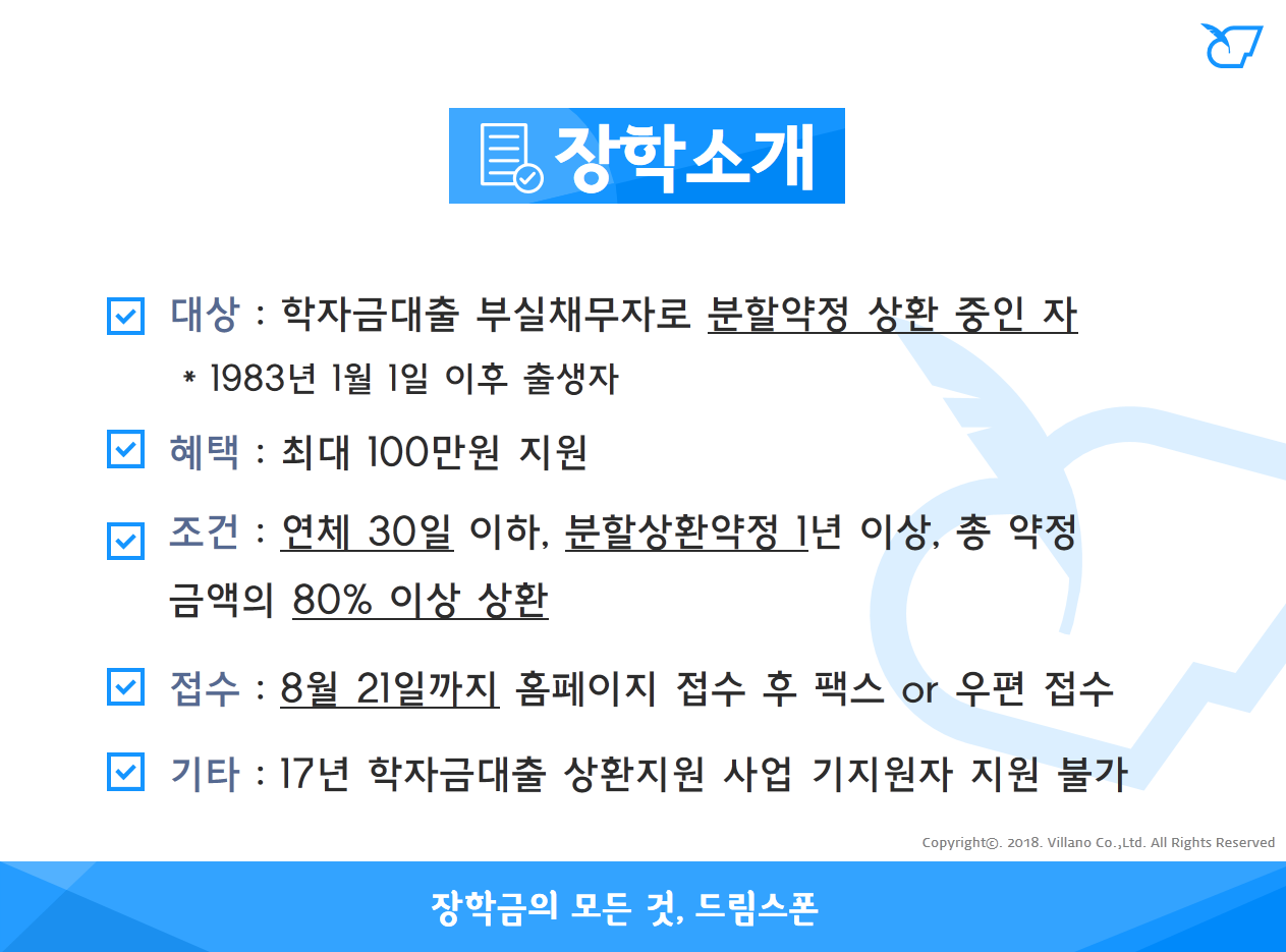 - 청년희망재단 홈페이지 접수 후, 한국장학재단 신용회복지원상담센터(☏1599-2250)를 통한 팩스 또는 우편접수