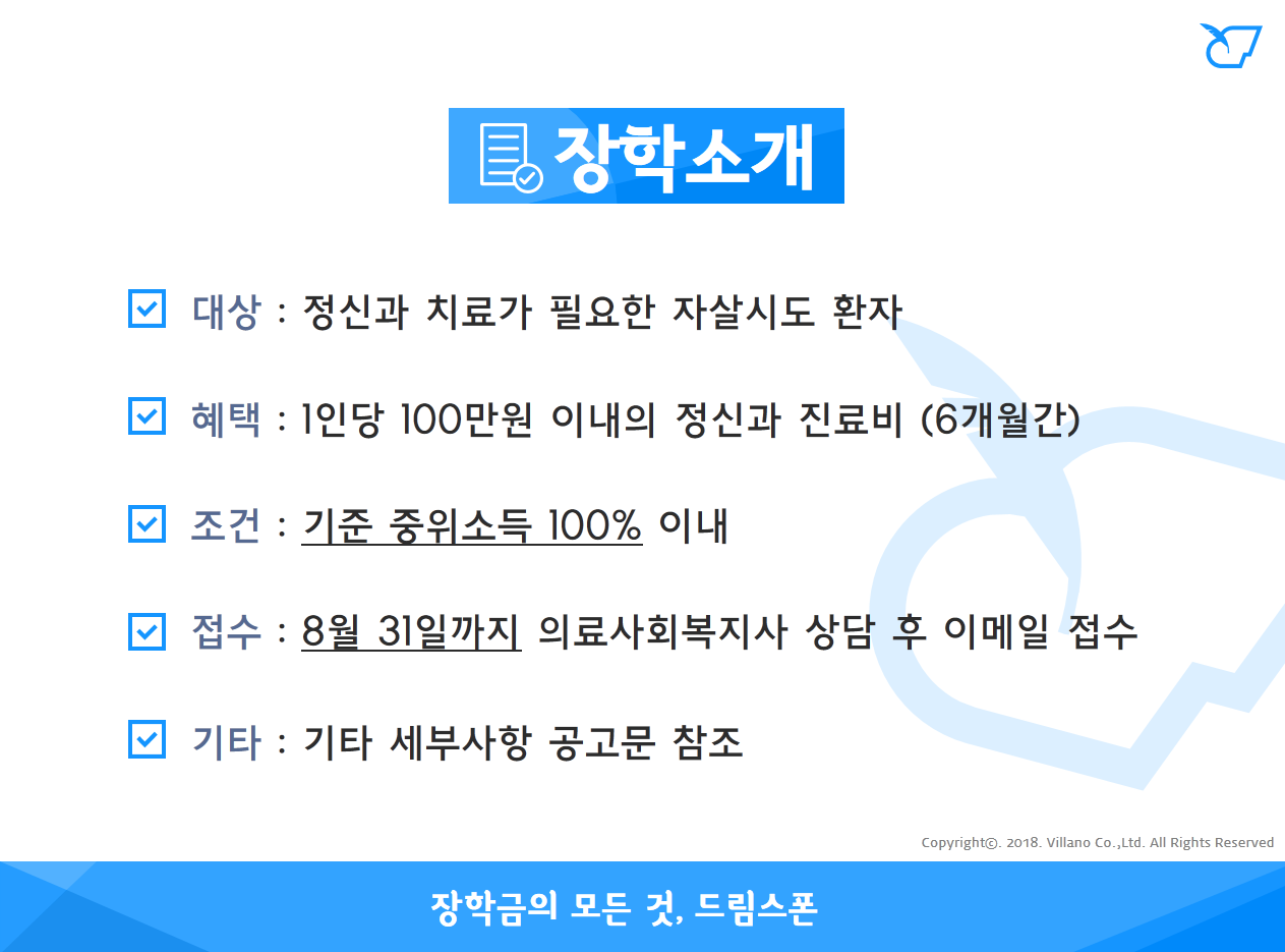 - 지원내역 : 1인당 100만원 이내의 정신과 진료비(입원비 및 외래진료비)
