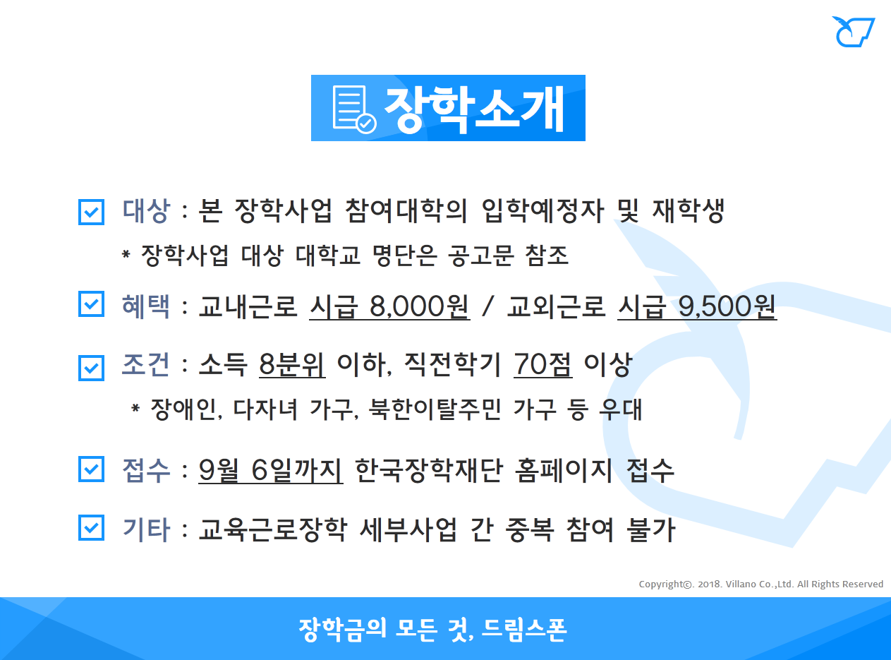 - 교내근로 : 시급단가 8,000원(’18.3월~’18.12월)/8,500원(’19.1월~’19.2월)