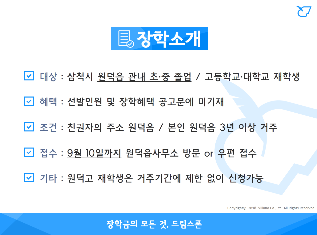 - 주소 : (25961) 강원도 삼척시 원덕읍 삼척로 440 (원덕읍사무소 원덕읍향토장학회 담당자 앞)