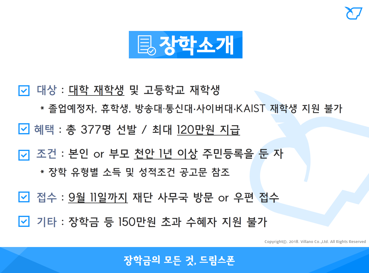 - 고등학생 : 275명 선발 / 일반장학 1인 70만원, 기능장학 1인 100만원, 관외장학 1인 100만원