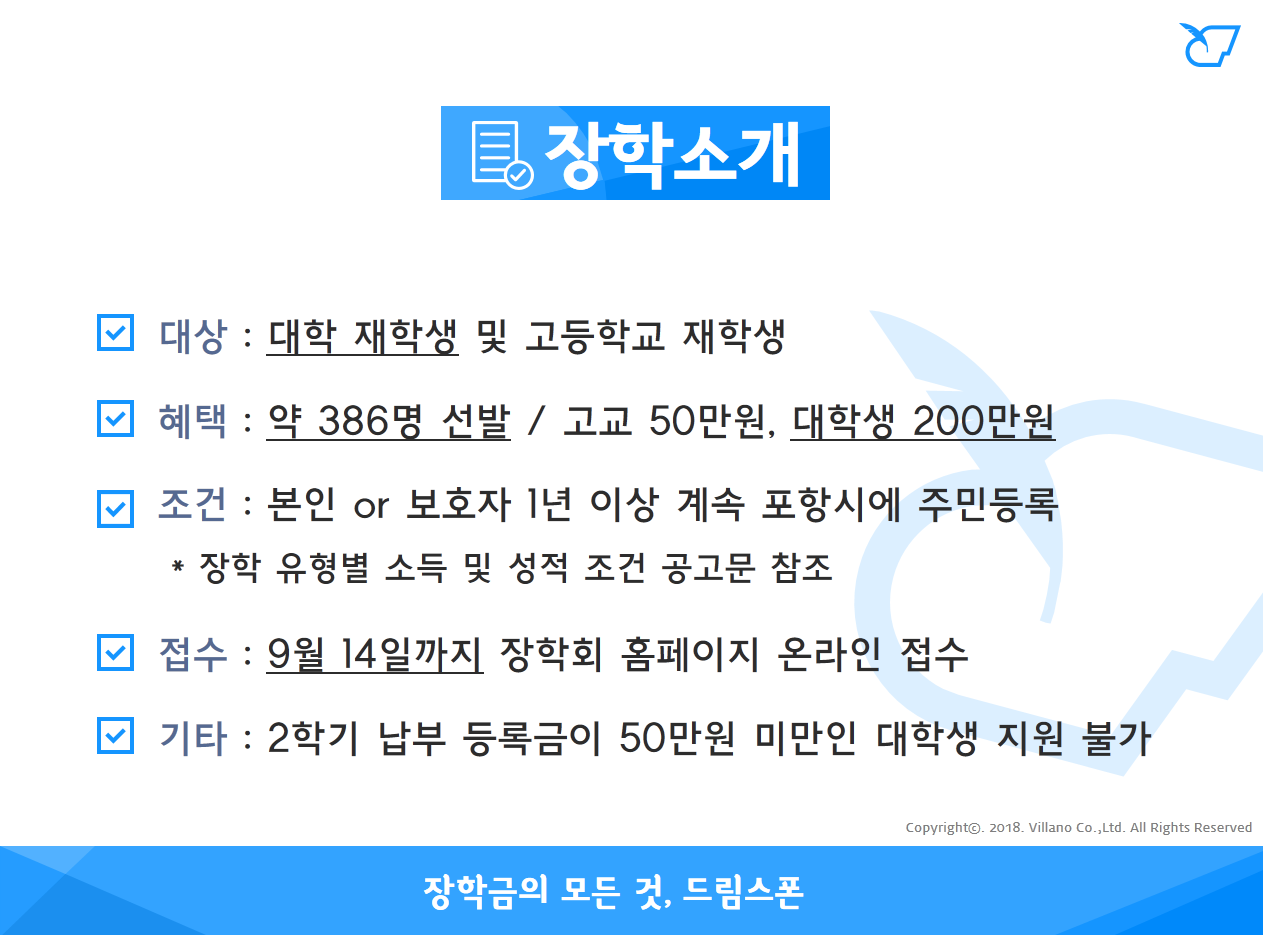 * 체육특기 장학금, 특별장학금, 고액기부자 추천 장학금은 모집기간 상이하므로 공고문 참조