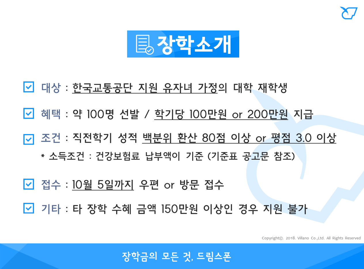- 지원금액 : 등록금 납부금액이 200만원 미만인 경우 장학금 100만원 지원, 등록금 납부금액이 200만원 이상인 경우 장학금 200만원 지원