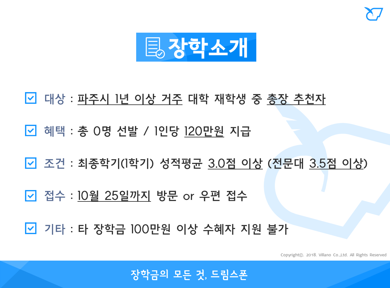 - 신청방법 : 장학생으로 신청하고자 하는 학생은 소정 서식의 신청서에 기타 구비서류를 첨부하여 제출(우편제출 가능)
