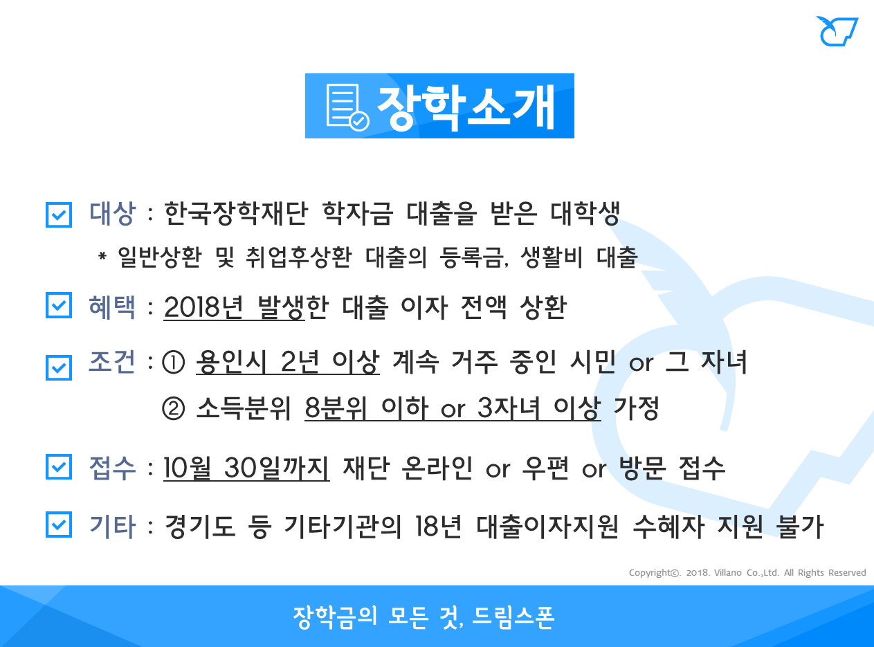 - 주소 : 용인시 처인구 중부대로 1199 용인시청 3층 인재육성재단
