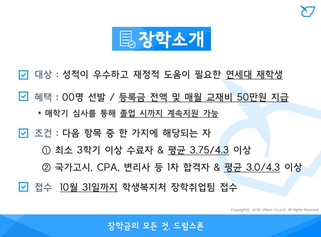 ① 모교에서 최소한 3학기 이상을 수료한 자로서 평량평균 3.75 이상(4.3만점)이며 재정적 도움이 필요한 자 (기초학문 전공자 우선)
