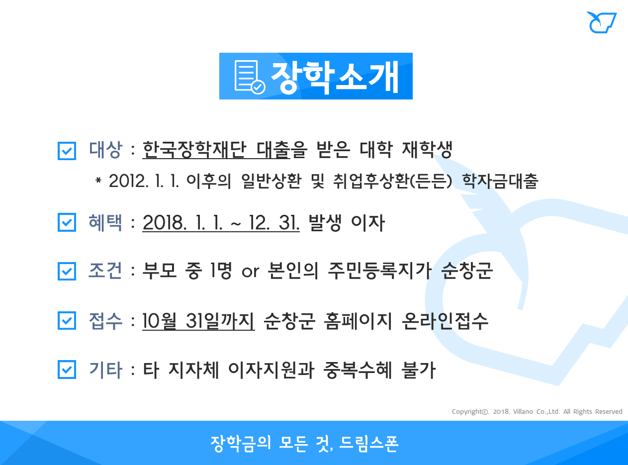 - 본인 또는 부모 중 한명이 순창군에 주민등록이 되어 있는 대학생(휴학생, 졸업자, 대학원생 제외)