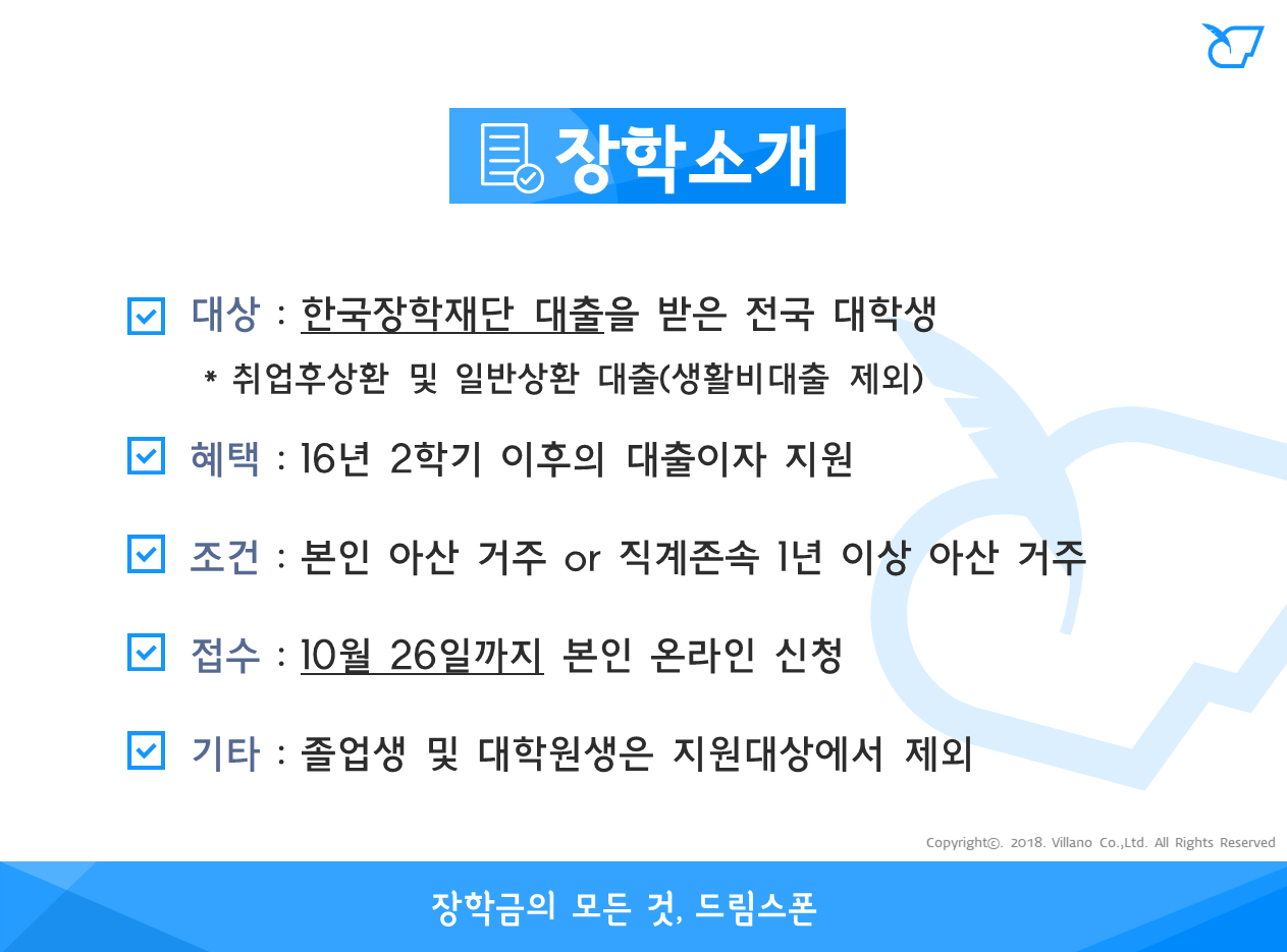 • 지원내용 : 2016년 2학기부터 한국장학재단에서 받은 취업후 상환 학자금(든든학자금) 및 일반상환 학자금의 대출이자(생활비 제외)