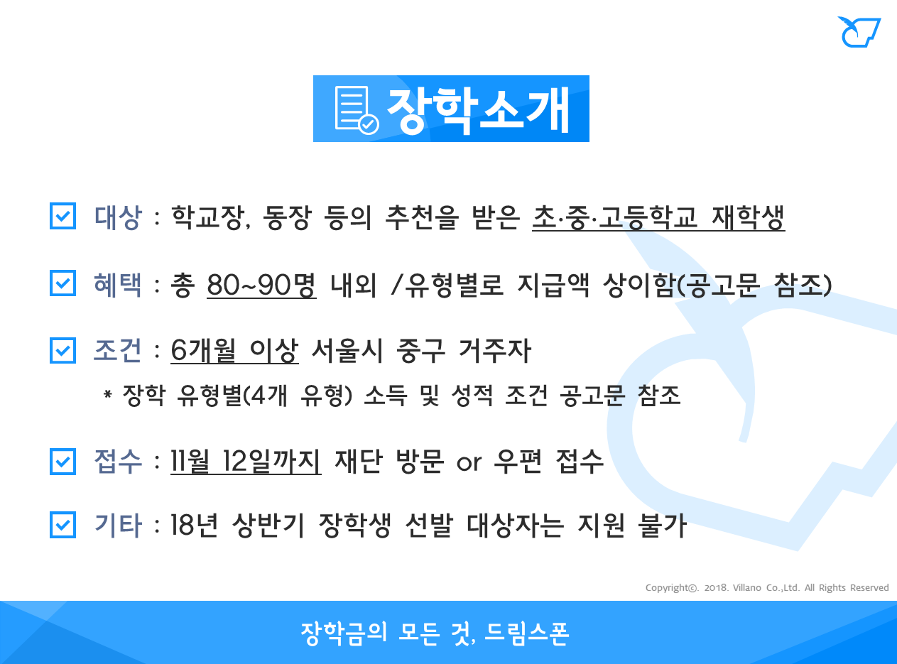 - 꿈드림 장학 : 중고생 35~40명 선발 / 중학생 1인당 50만원, 고등학생 1인당 150만원 지급