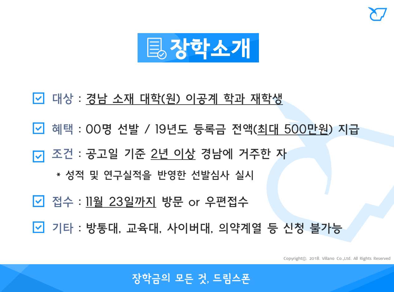 - 장학금 지급액 : 2019년도 등록금 전액(1인당 최대 500만원)