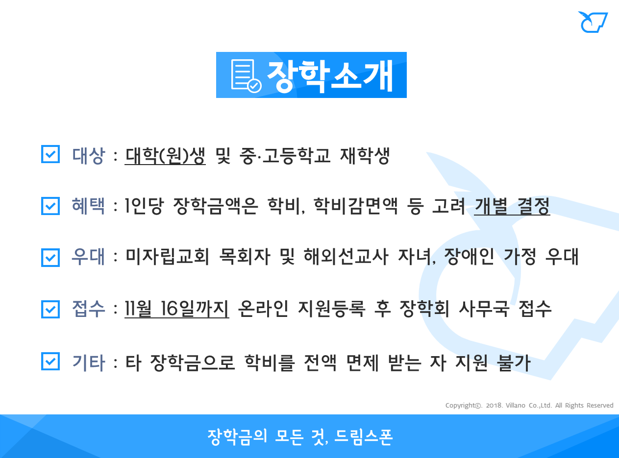 * 13기 1인당 장학금 규모 : 중학생 80만원, 고등학생 140만원, 대학생 이상 (국내) 400~500만원 or (국외) U$5,000~U$6,000 지급