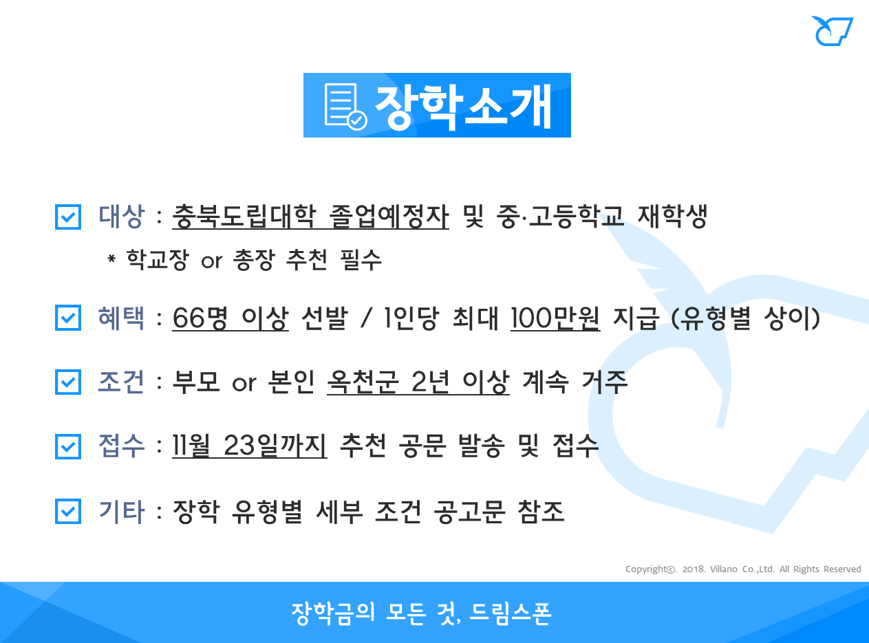 - 예체능특기장학 : 예산범위 내 선발(예산 1,000만원) / 개인 최대 100만원, 단체(2~4명) 최대 150만원, 단체(5명 이상) 최대 200만원 지급