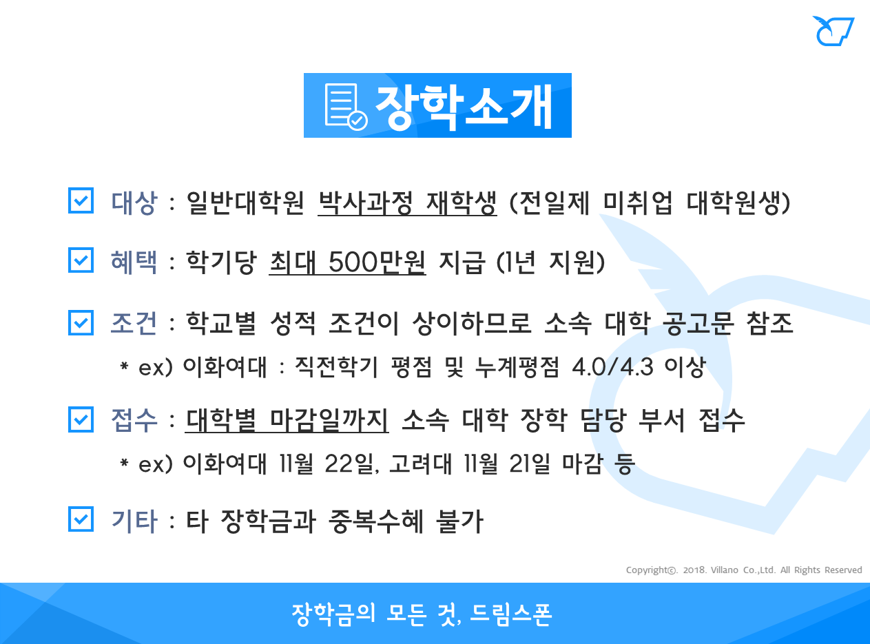 - 장학금액 : 학기당 최대 500만원 (지원기간 1년)