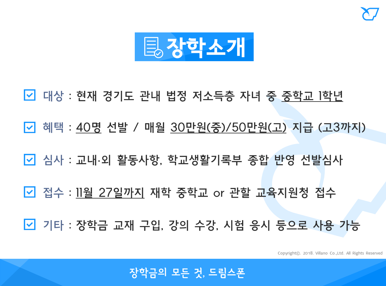 - 장학금액 : 매월 30만원(중학생), 50만원(고등학생) 지급