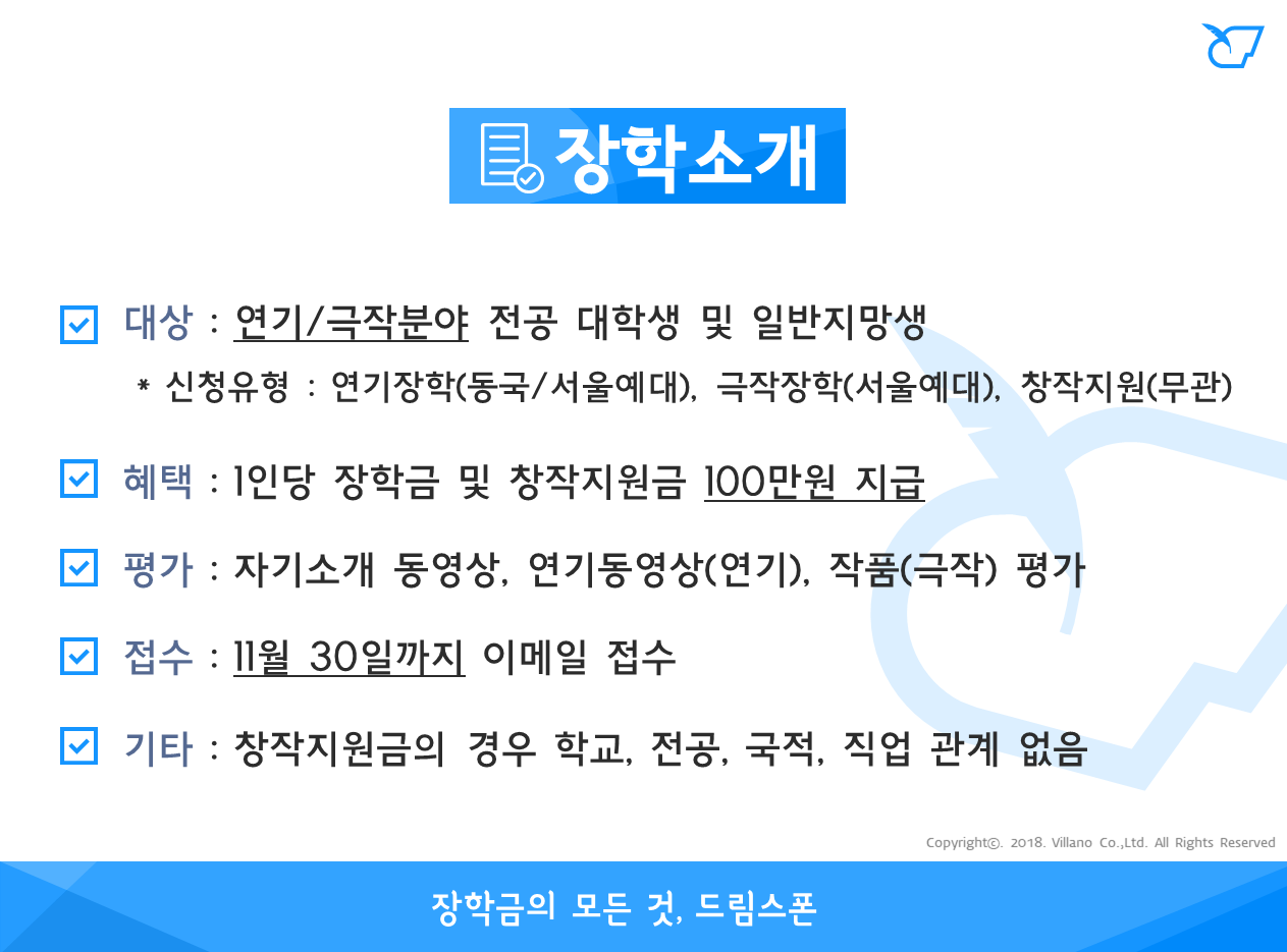 - 연기장학 : 동국대/서울예대 각 1명 선발