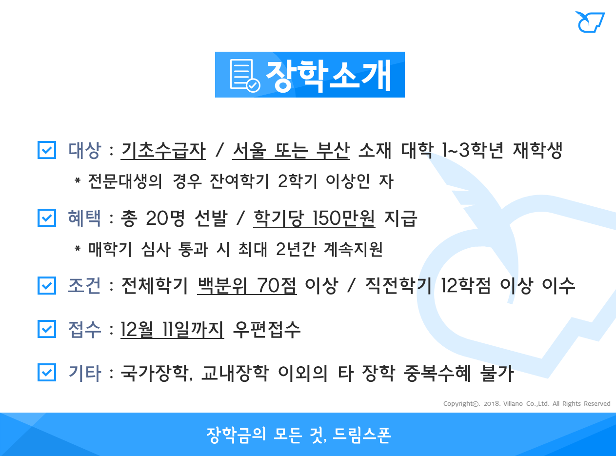 - 학기당 150만원 지원(등록금 및 생활비 등)