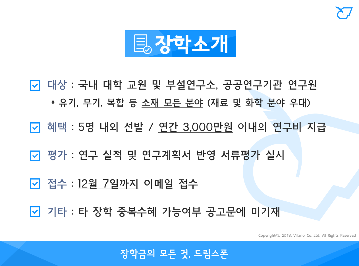 - 장학금액 : 인당 연간 3,000만원 이내의 연구비 지원