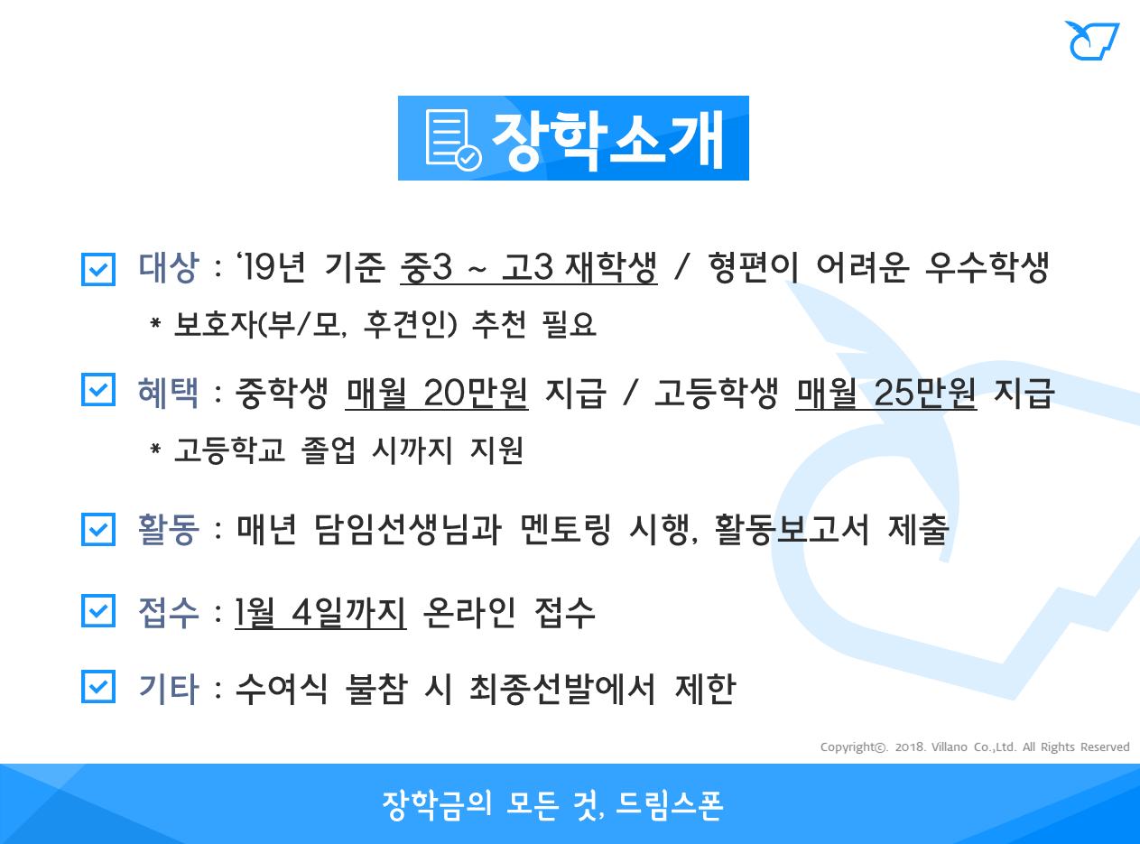 - 장학금액 : 중학생 매월 20만원(연간 240만원), 고등학생 매월 25만원(연간 300만원">