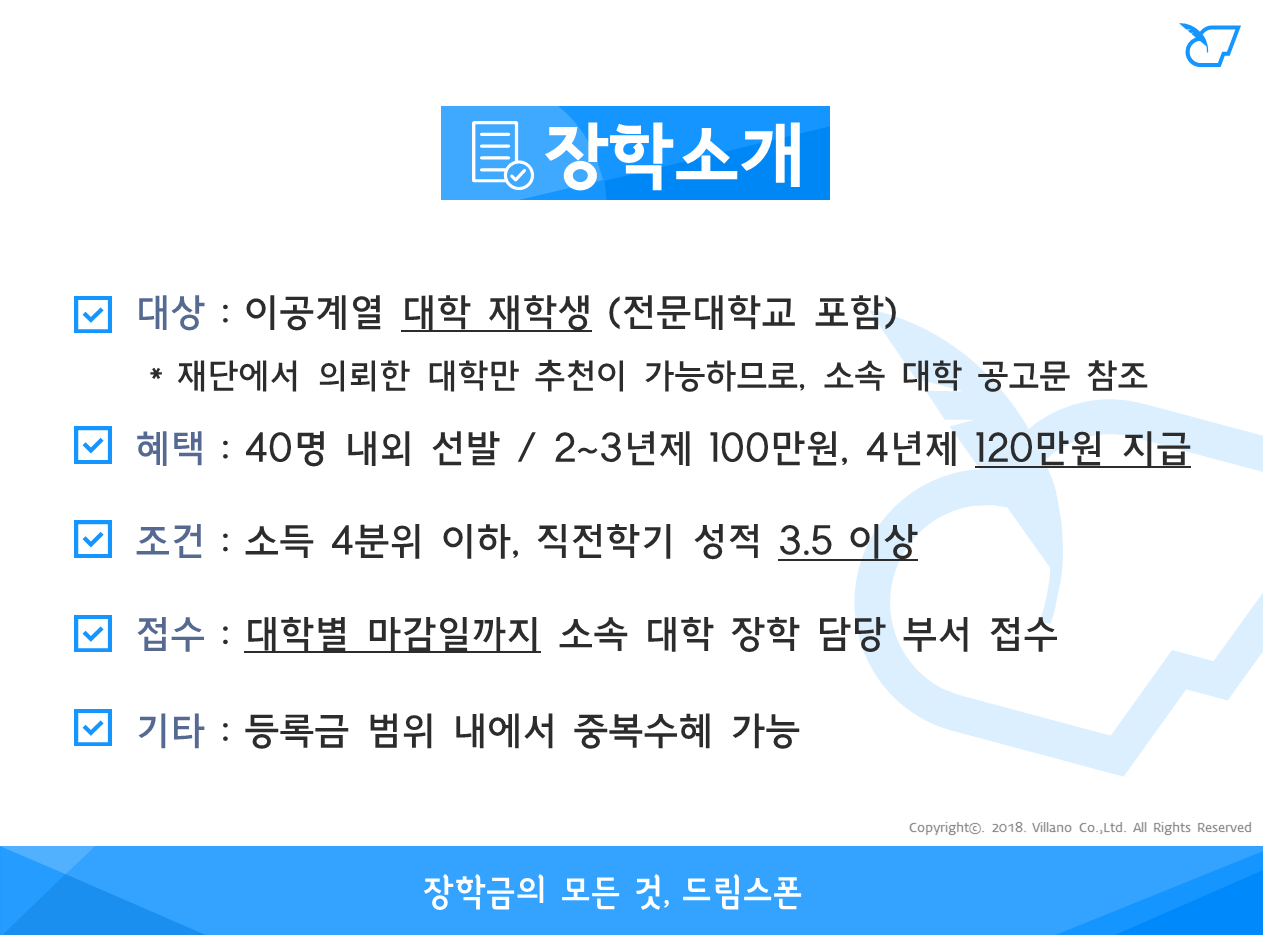 - 장학금액 : 2~3년제 대학생 100만원, 4년">