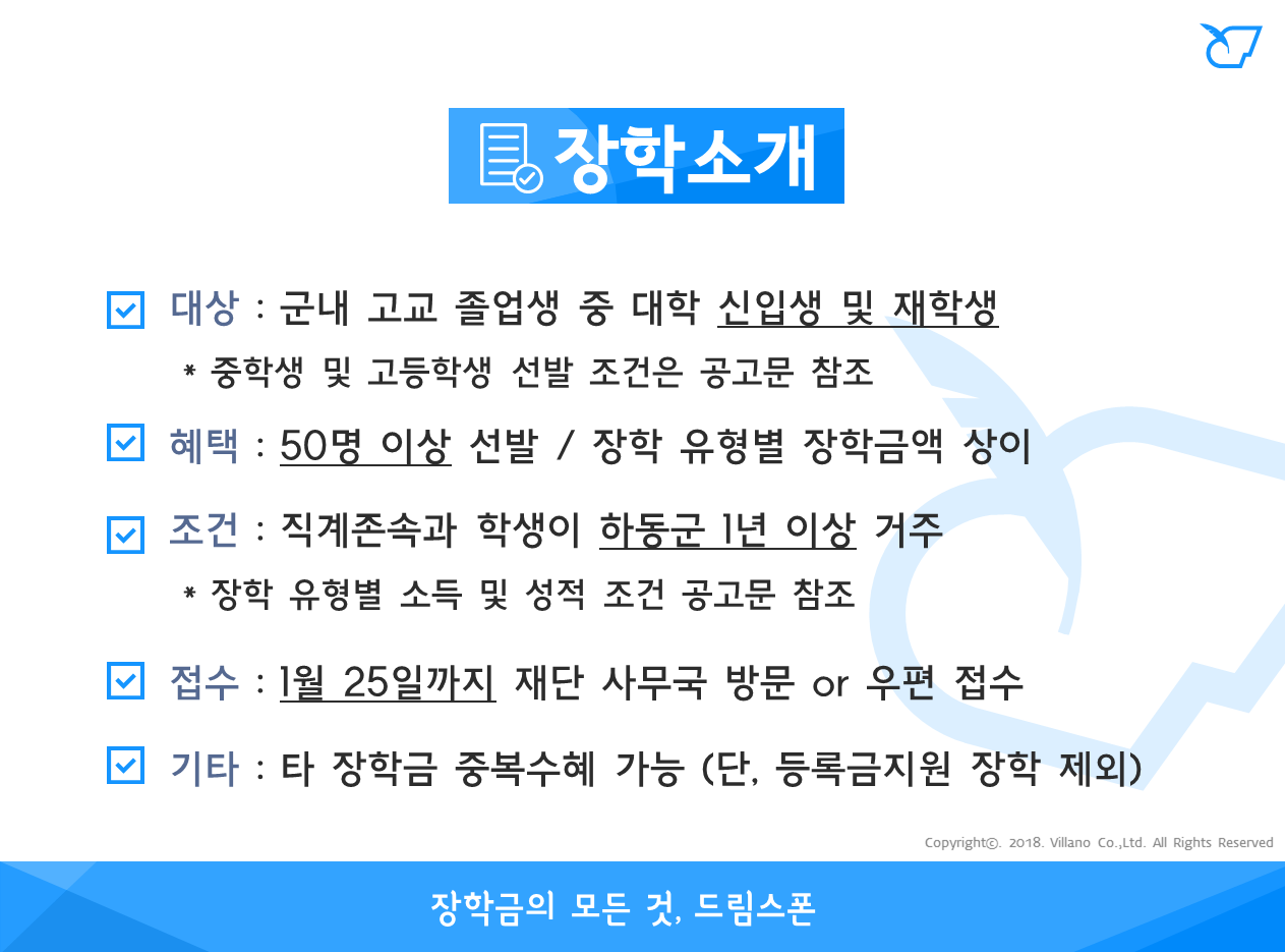 * 등록금 지원장학 및 초중고생은 학교별로 신청하므로 소속 학교 공고 참조